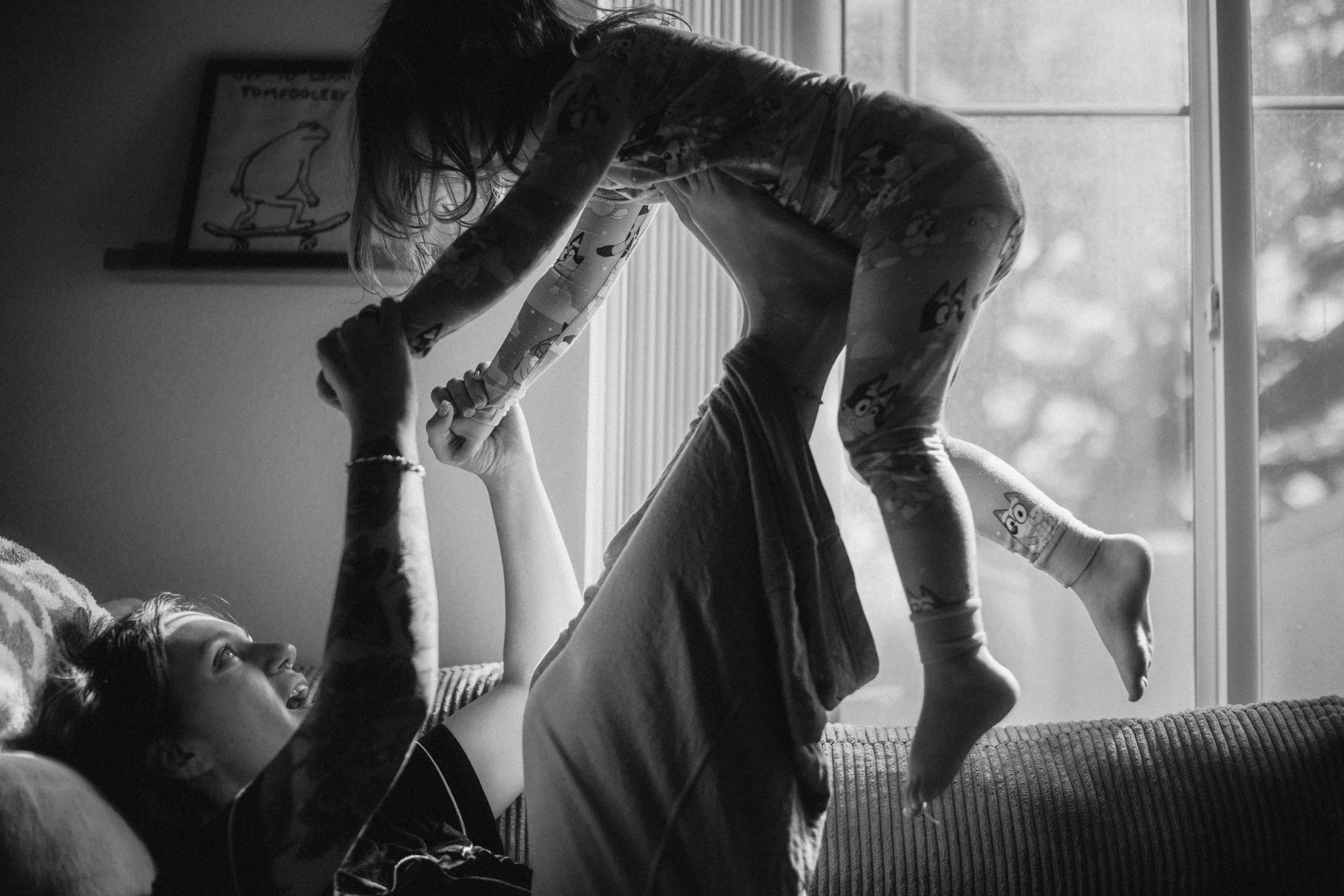 Photographed through a window, the frame is layered with reflections of trees and afternoon light, creating a dreamy veil between the viewer and the moment unfolding inside. A fellow mother and artist holds her baby in warm sunlight, their connection soft and unguarded. Nothing feels staged or forced — just a quiet moment that would have existed whether a camera was there or not.